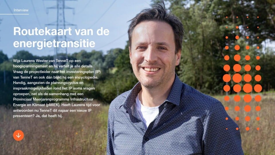 Wijs Laurens Wester van TenneT op een hoogspanningsmast en hij vertelt je alle details. Vraag de projectleider naar het investeringsplan (IP) van TenneT en ook dán blijkt hij een encyclopedie. Handig, aangezien de planningscyclus en inspraakmogelijkheden rond het IP soms vragen oproepen, net als de samenhang met een Provinciaal Meerjarenprogramma Infrastructuur Energie en Klimaat (pMIEK). Heeft Laurens tijd voor antwoorden nu TenneT dit najaar een nieuw IP presenteert? Ja, dat heeft hij.