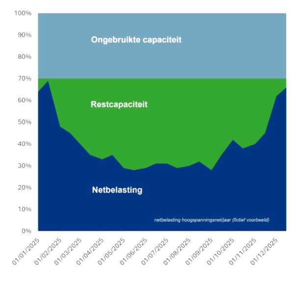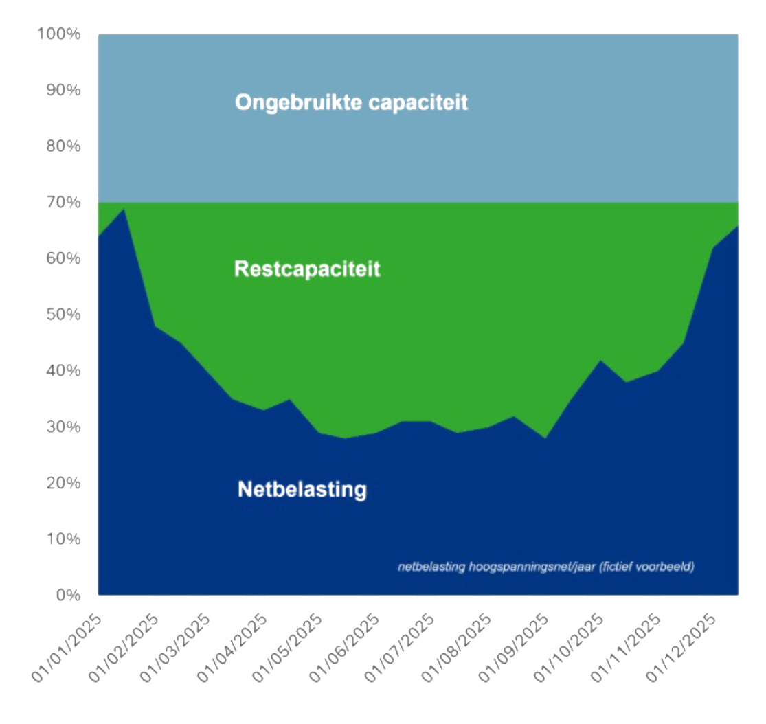 Is er nog ruimte boven het daadwerkelijke transportverbruik, dan noemen we dat de ongebruikte capaciteit (in grijs/blauw). Dit komt alleen voor in gebieden waar geen sprake is van netcongestie.